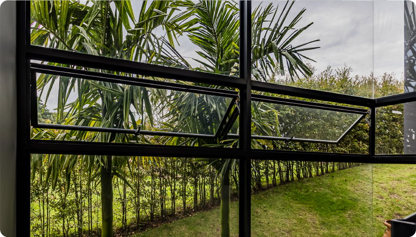 Ventilación eficiente, controlada y armónica. Los sistemas proyectantes poseen bisagras ubicadas en la parte superior, abriendo hacia afuera y permitiendo ventilación incluso con lluvia. Mientras que los sistemas oscilobatientes poseen bisagras en las partes vertical y horizontal del marco combinando las aperturas batientes y oscilantes, aprovechando el ángulo de apertura para dar control.